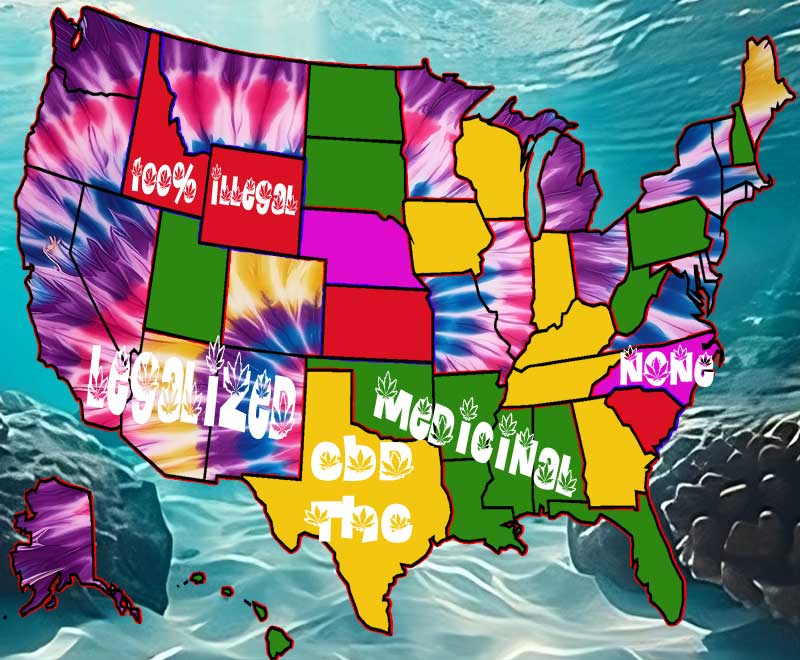 Map Explanations. RED = 100% Everything Illegal. GREEN is Medicinal Legal. PINK is nothing legal, which makes us wonder why it is different than the RED States. TIE DIE Fully Legal. YELLOW is only CBD with THC legal.